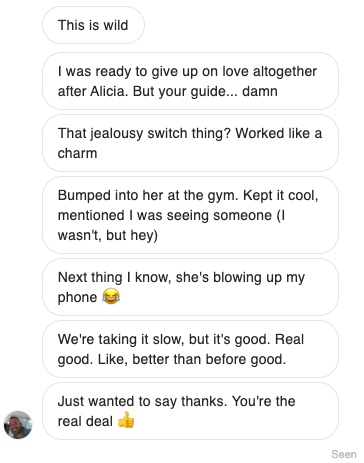 when she left me for another guy, I thought my world had ended. I couldn't eat or sleep. saw the guide on IG and had to cop it. those competition techniques worked like crazy 😂 basically she started comparing me to her new guy (in a good way). last month, she broke it off with him and asked for another chance with me. we're taking it slow, but things are better than ever 🙏